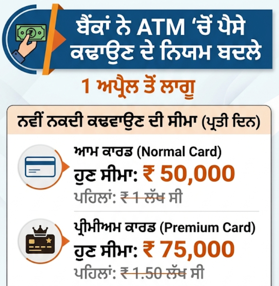 ਬੈਂਕਾਂ ਨੇ 1 ਅਪ੍ਰੈਲ ਤੋਂ ATM ‘ਚੋਂ ਪੈਸੇ ਕਢਾਉਣ ਦੇ ਨਿਯਮ ਬਦਲੇ || ਹੁਣ ਇਕ ਵਾਰ ਚ ਤੁਸੀ ਸਿਰਫ 50,000 ਰੁਪਏ ਕਢਵਾ ਸਕੋਗੇ, ਆਮ ਕਾਰਡ ‘ਚੋ ਪੈਸੇ ਕਢਵਾਉਣ ਦੀ ਸੀਮਾ 1 ਲੱਖ ਤੋਂ ਘਟਾ ਕੇ 50 ਹਜ਼ਾਰ ਤੇ ਪ੍ਰੀਮੀਅਮ ਕਾਰਡ ਦੀ 1.50 ਲੱਖ ਤੋਂ ਘਟਾ ਕੇ ਕੀਤੀ 75000 ਰੁਪਏ ਪ੍ਰਤੀ ਦਿਨ || OTP ਦੇ ਨਾਲ ਲੈਣ-ਦੇਣ ਲਈ password, MPIN, ਜਾਂ ਬਾਇਓਮੈਟ੍ਰਿਕ ਹੋਵੇਗੀ ਲਾਜ਼ਮੀ